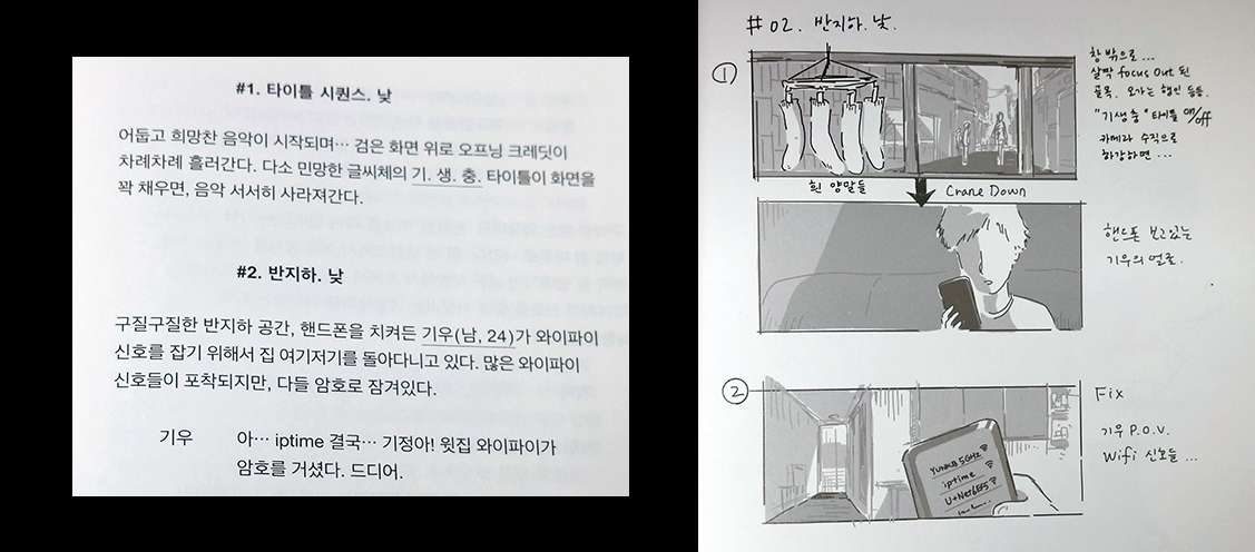 봉준호 감독은 말합니다. 그는 시나리오와 스토릴보드를 쓰는 시간이 가장 외롭고 외로웠던 시간의 기록이라고 말합니다. 촬영장에서 재미있고 힘든 순강르 꿰뚫기 전의 고요하고 개인적인 순간이라고 합니다. 감독은 대본을 공개하기 전에 감독 자신의 기록을 보여줄 것이라는 생각으로 작업했습니다. 그래서 그는 대본에 오타가 있어도 개의치 않았습니다. 손으로 쓴 손글씨도 스토리보드에 인쇄되었습니다. 그는 이 책에서 그가 영화를 얼마나 정교하게 준비했는지에 대해 이야기합니다. 또한 촬영 현장을 얼마나 자세하게 계획하는지 설명합니다. 감독은 대본과 스토리보드의 내용을 완성된 영화 <기생충>과 비교해 보라고 합니다. 감독은 변경된 디테일이 감독의 끊임없는 고민을 보여준다고 고백했습니다.